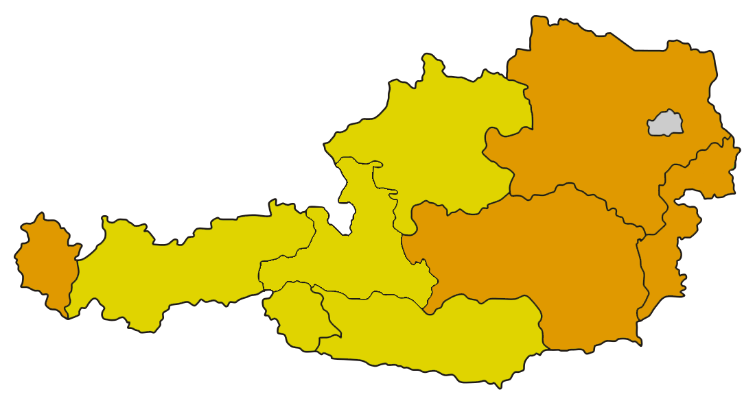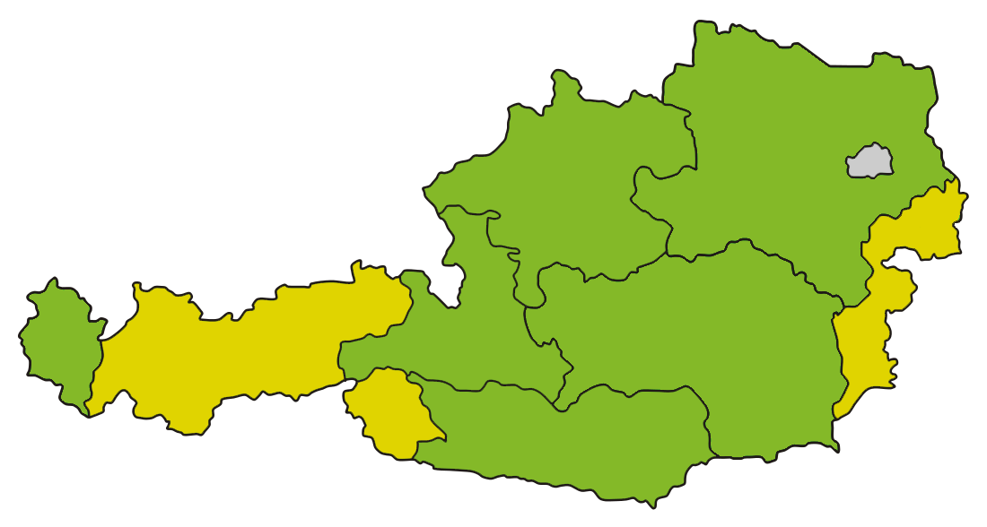 Die Einfärbung der Karte basiert auf einer multikriteriellen Bewertung der Landwirtschaftskammern und Waldverbänden und wird bis spätestens 5. und 20. des Monats aktualisiert!