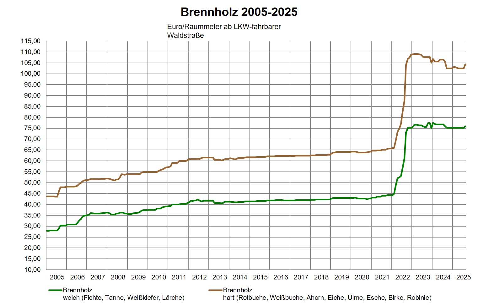 Detaillierte Abbildung der Preise (Durchschnitt des Vormonats bzw. Beginn des aktuellen Monats) für Holz in den wichtigsten Lieferformen gegliedert nach Bundesländern.