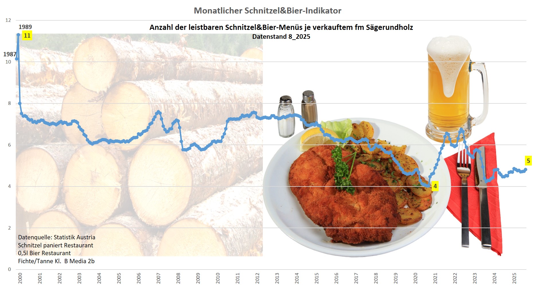 Die Grafik veranschaulicht, wieviele Schnitzel und Bier im Restaurant durch den Verkaufserlös eines Festmeters Fichten Sägerundholz theoretisch leistbar sind. Zu beachten ist, dass die Erntekosten dabei nicht berücksichtigt wurden. Das Maximum lag 1989 bei 11 Menüs, das Minimum mit 4 Menüs im Jahr 2020. Die Grafik zeigt anschaulich, dass Preissteigerungen beim Rundholz durch allgemeine Kostensteigerungen - Schnitzel und Bier stehen stellvertretend für Lebens-, Personal-, Maschinen- und Betriebsmittelkosten - egalisiert werden.