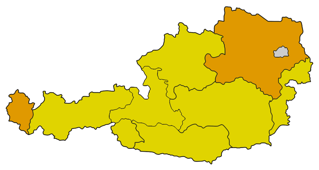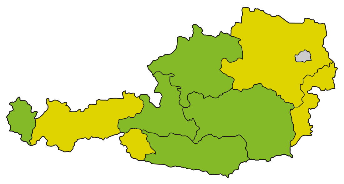 Die Einfärbung der Karte basiert auf einer multikriteriellen Bewertung der Landwirtschaftskammern und Waldverbänden und wird bis spätestens 5. und 20. des Monats aktualisiert!